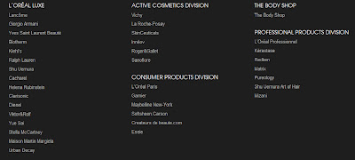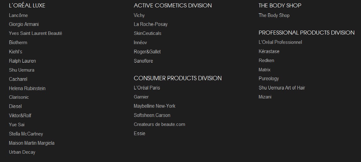 Dar l’Oreal ca si afacere nu inseamna numai Elseve sau l’Oreal Paris, inseamna mult mai multe marci, multe produse si multa cercetare pe tot ce inseamna frumusete si ingrijire. Iata mai jos o poza luata de pe site-ul oficial l’Oreal cu o panorama a tuturor marcilor din cadrul acestui grup.