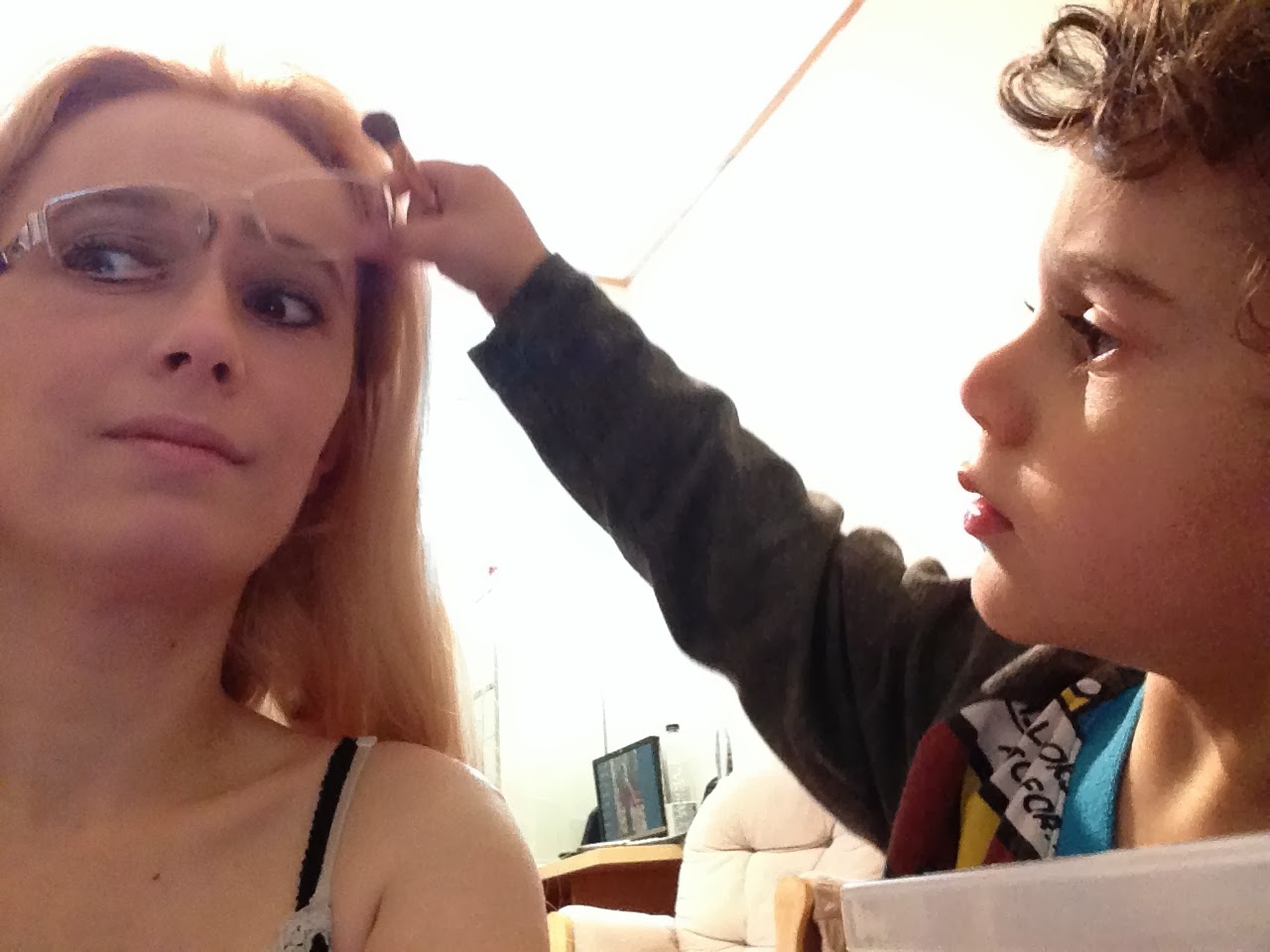 Pe langa ochelarii care m-au cam obosit, a mai aparut un mic factor “ultra-creativ”, baietelul meu, care dupa ce a plans la usa baii ca vrea sa intre sa ma machieze el, mi-a “finisat” machiajul si m-a cam oprit din avantul meu de a realiza un machiaj demn de concurs.